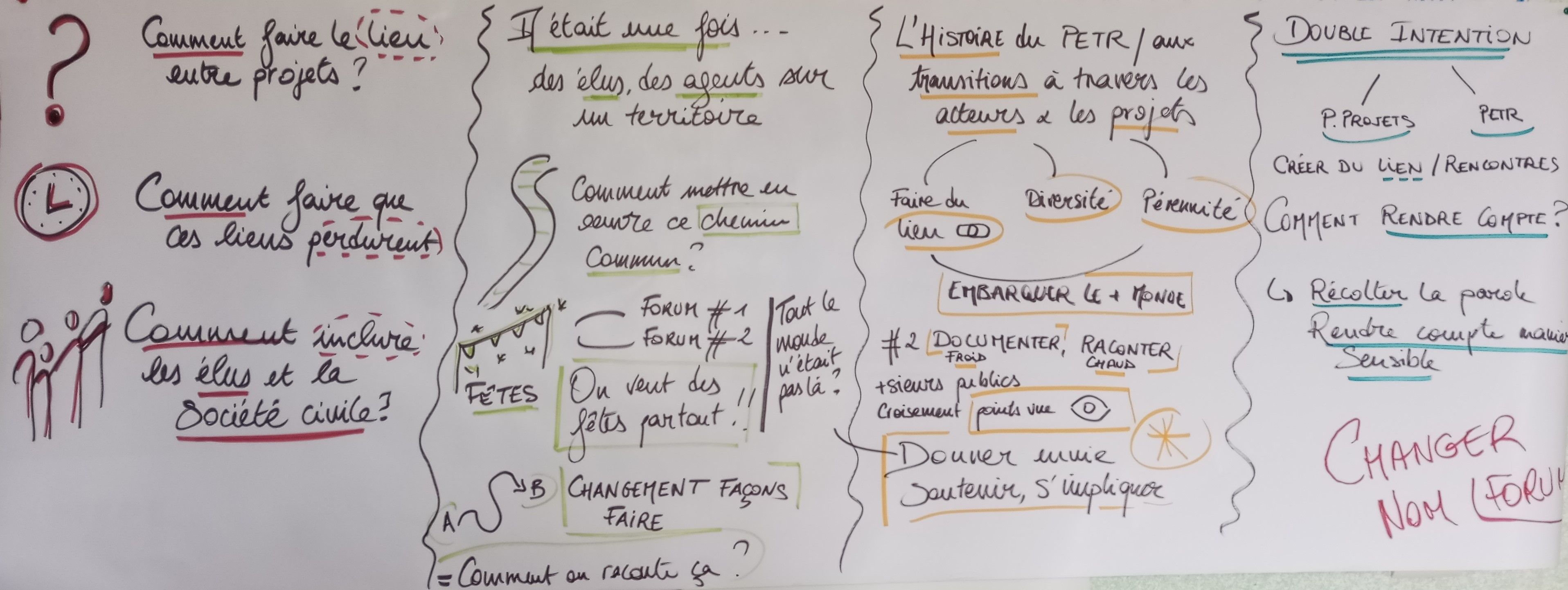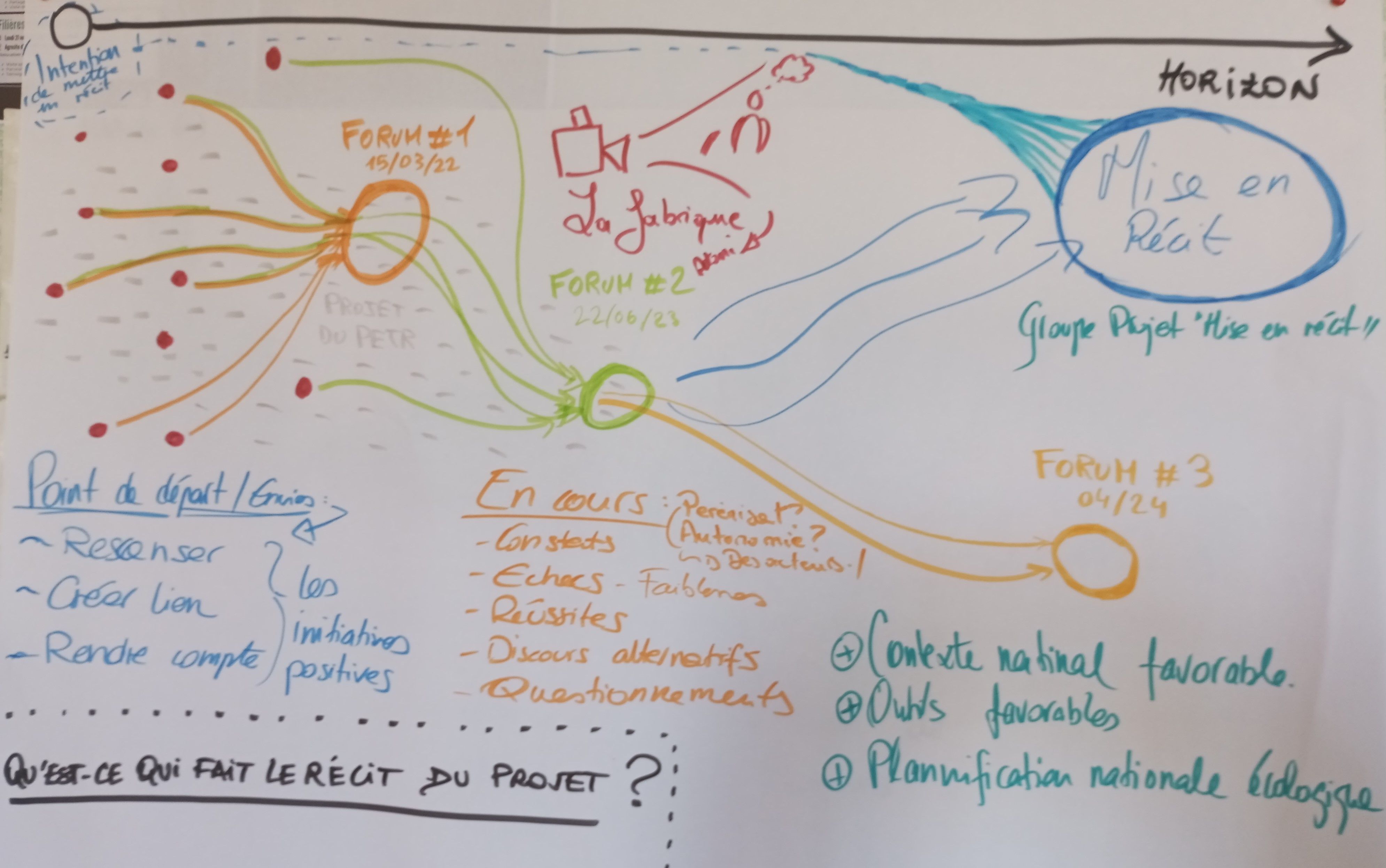 Il y'a le fil, les intentions du projet de territoire et des forums et il y'a l'histoire de la mise en récit, sa mise en abyme. La mise en récit sert à embarquer plus de monde dans le projet de territoire, qu'il y'ait plus de sensibilité dans les transitions et notamment auprès des élus, qu'ils comprennent que c'est déjà une réalité sur le territoire. Pour embarquer les gens, il faut les inclure. Dans notre histoire, ils n'apparaissent pas encore. Tout un pans de personnes qui ne sont pas inclues depuis le départ ne vont pas se sentir concernées. Il manque dans notre trajectoire des pôles d'acteurs. La mise en récit est une action participative qui permet de lier le fond et la forme.