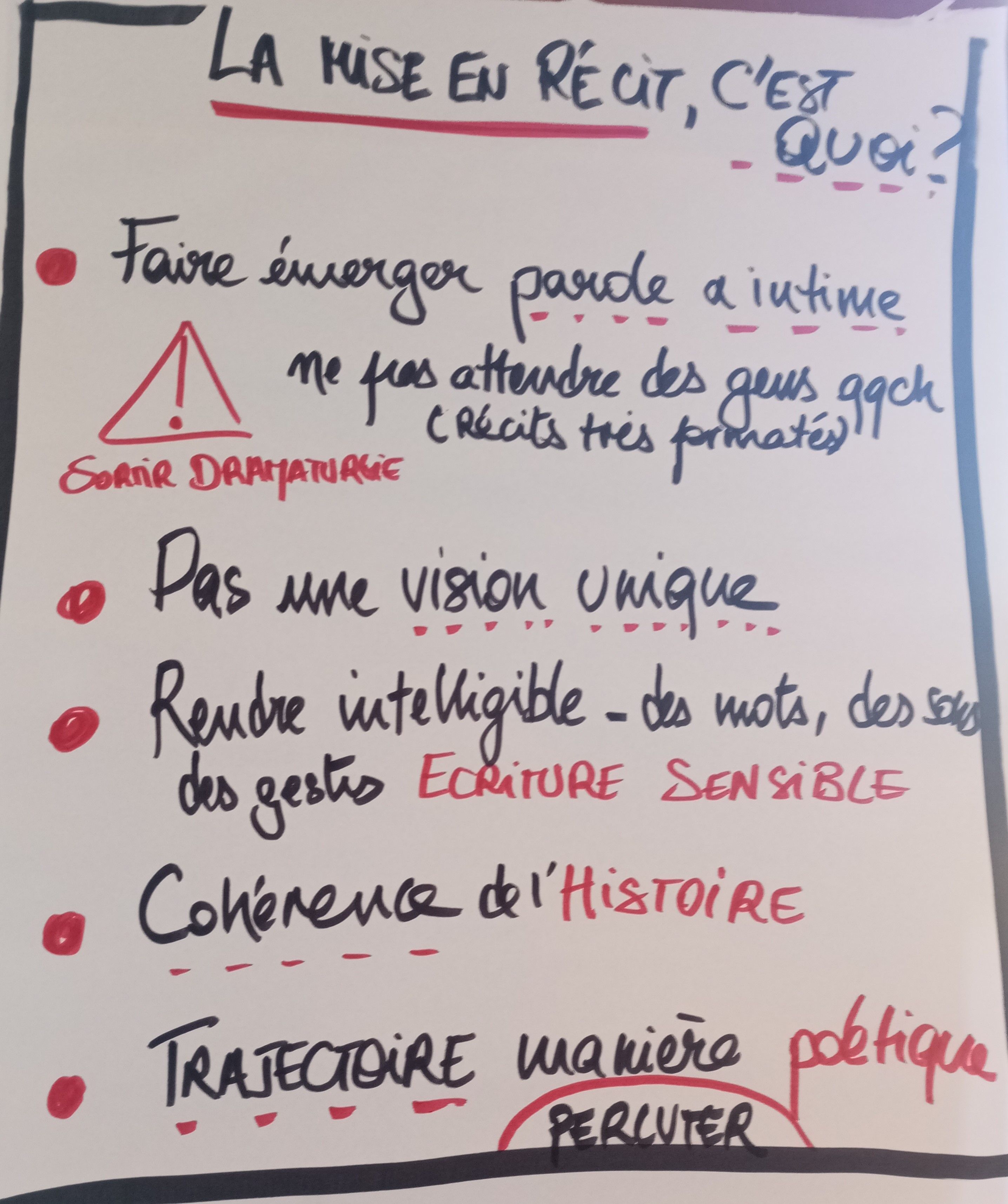 Il faut incarner notre récit. A ce stade, il n'y a pas d'incarnation. On voit la trajectoire, on comprend la temporalité. Mais il faut essayer de trouver une trajectoire plus émotionnelle. Tout ce qui s'est noué d'un point de vue émotionnel durant ces rencontres ça se raconte. Les mots sont importants. Le doute, les projets qui n'ont pas abouti, les connexions qui ne se sont pas traduites en projets.... tout cela peut donner naissance à d'autres rencontres, à d'autres outils. La note t'intention, notre synopsis n'est pas encore suffisamment clair.